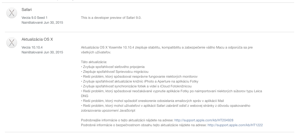 OS X 10.10.4 Yosemite ďalej rieši problém, kvôli ktorému mohlo dôjsť k oneskorenému poslaniu e-mailovej správy v aplikácii Mail. Užívatelia sa tiež dočkajú opravy, kvôli ktorej mohlo opakované zobrazovanie JavaScript upozornení zabraňovať užívateľom odísť z webovej stránky v Safari. Aktualizácia je dostupná pre všetkých užívateľov OS X Yosemite zadarmo už teraz a môžu si ju stiahnuť zo sekcie Software Update v Mac App Store.