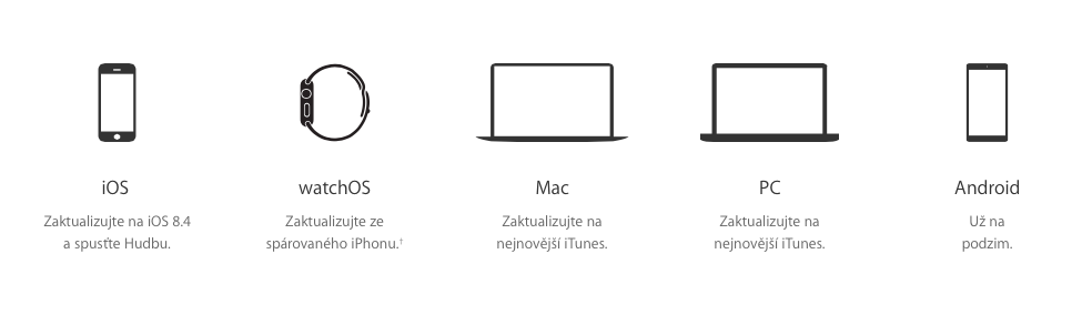 Apple Music můžete používat na iPhonu, iPadu, iPodu Touch, Apple Watch, na Macu s nejnovějším iTunes, na PC s Windows s nejnovějším iTunes a na podzim dokonce i na Androidu a Apple TV. V případě Apple Watch je potřeba vlastnit iPhone 5 a novější, abyste mohli Apple Music na hodinkách využívat a služba zde po nahrání skladeb dokonce funguje i bez iPhonu.