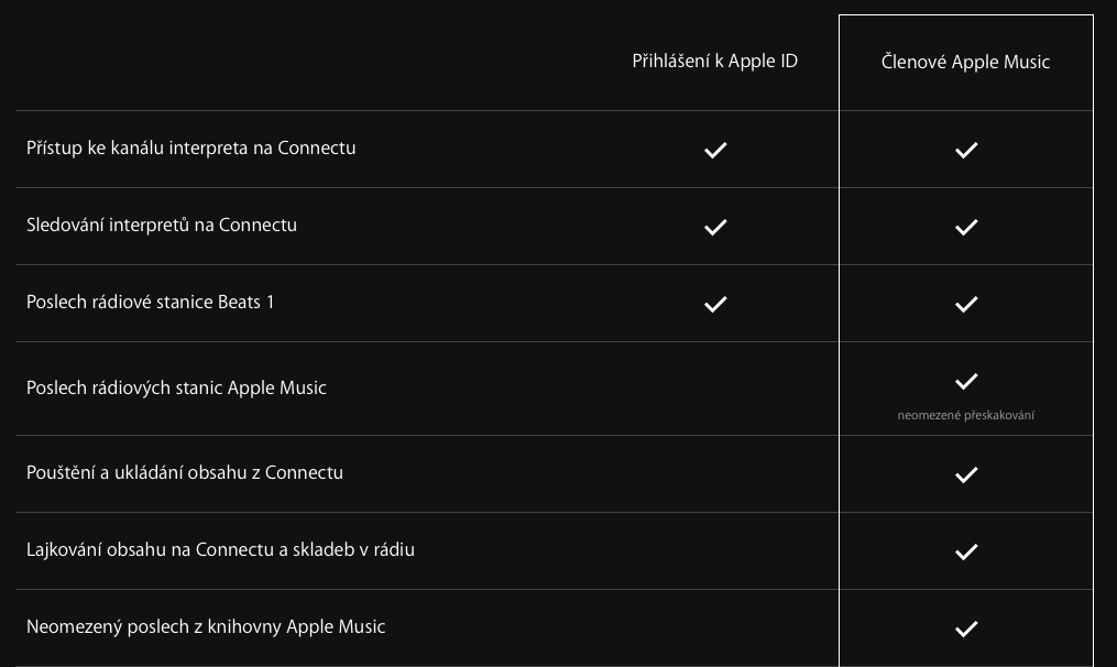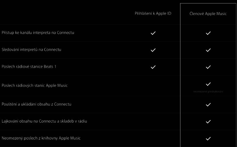 Apple Music lze využívat i bez členství. Stačí vám k tomu pouze AppleID. V takovém případě získáte přístup ke kanálu interpreta na Connectu a můžete jej sledovat. Nemůžete poslouchat hudbu z Apple Music, ale Beats 1 ano a to i bez toho, aniž byste cokoli zaplatili.