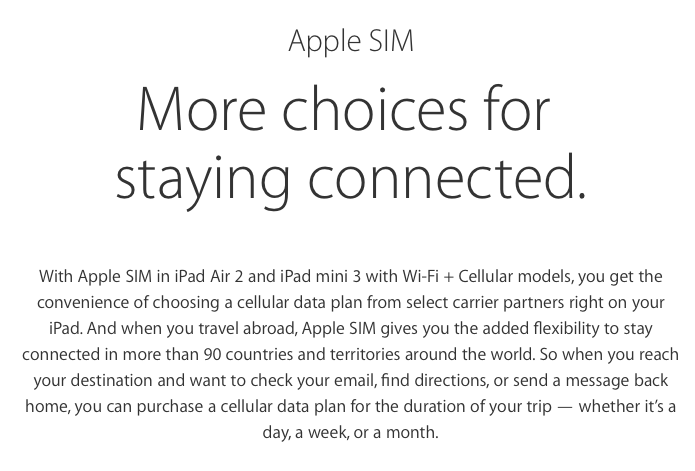 Apple sa minulý rok pri predstavení iPadu Air 2 rozhodol potichu uviesť vlastnú univerzálnu SIM kartu, na ktorej si sami vyberiete operátora a následne zvolíte dátový program, ktorý vám najviac vyhovuje. Nanešťastie, Apple SIM karta bola dostupná len v USA a Veľkej Británii, ale dnes spoločnosť oznámila podporu karty vo viac ako 90-tich krajinách sveta, medzi ktoré patrí aj Česká Republika a Slovensko vďaka GigSky.