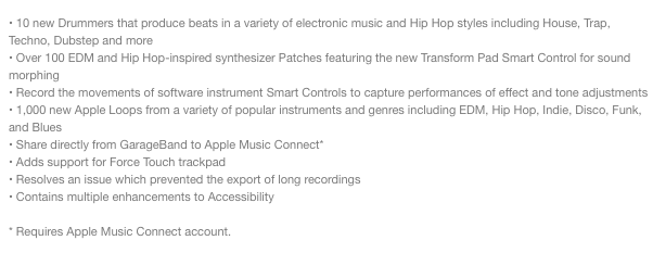 Novinka ďalej obsahuje 10 nových drummerov, vďaka ktorým si môžete jednoduchšie vytvoriť vlastnú house, trap, techno alebo dubstepovú skladbu. Okrem toho je k dispozícii viac ako 100 nových EDM a hip-hopových modifikácií pre syntetizér, ako aj nový Transform Pad Smart Control s možnosťou úpravy znenia daného syntetizéru. Ďalej je tu 1000 nových Apple loopov pre rôzne žánre, ktoré zahŕňajú opäť EDM a hip-hop, ale aj indie hudbu, disco, funk a blues. Nechýba tu ani možnosť nahrávať pohyby v Smart Controls, vďaka čomu sa efekt automaticky zaznamenáva do finálnej podoby danej skladby. Inou novinkou je podpora Force Touch trackpadu na nových MacBookoch a MacBookoch Pro a tiež tu bola opravená chyba, kvôli ktorej nebolo možné exportovať dlhé nahrávky.