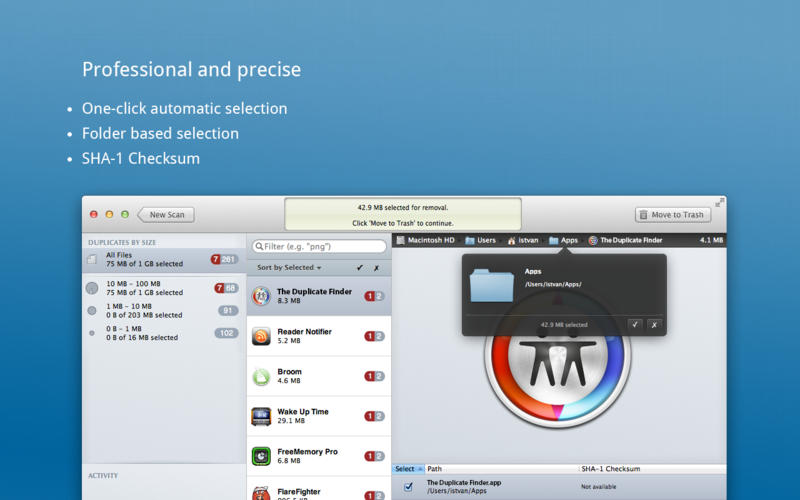 Aplikace Duplicate Finder dokáže rychle, elegantně a precizně vyhledat duplikované soubory ve vašem Macu. Těchto souborů se za pomocí aplikace také velmi rychle zbavíte. Duplicate Finder obsahuje ultra rychlý skenovací systém, který ukazuje výsledky v reálném čase, dále nabízí výběr duplikátů za pomocí jednoho kliknutí a mnoho dalších nezbytných funkcí pro váš Mac.