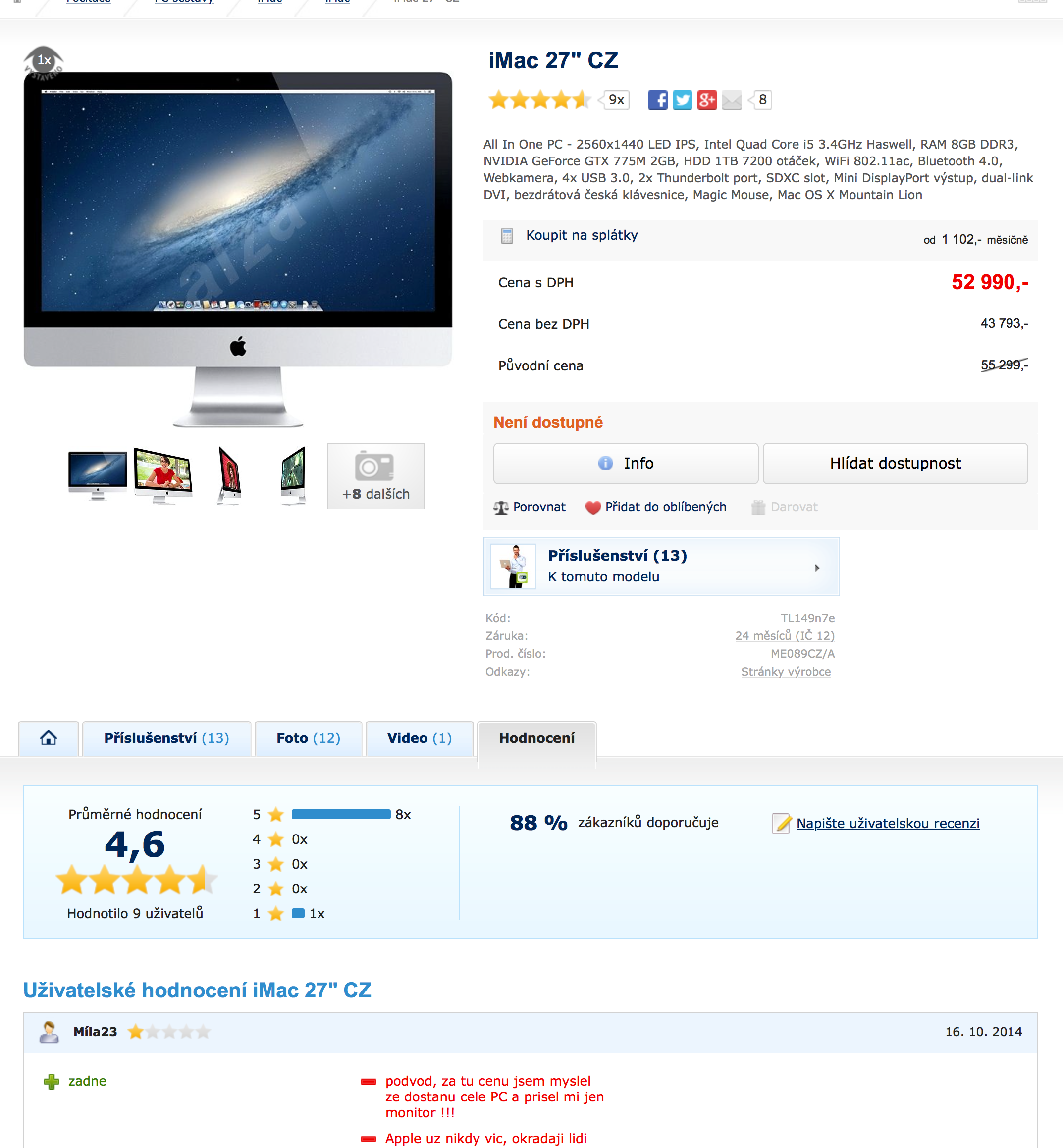 Recenzí produktu jej můžete dostat do neuvěřitelných prodejních čísel, zcela jej zničit a nebo ze sebe zkrátka uděláte idiota. Právě třetí možnost se povedla chlapcovi s přezdívkou Míla23, který recenzoval iMac v rámci uživatelských recenzí na alza.cz. Chlapec okomentoval počítač za 52 990Kč slovy: „Podvod, za tu cenu jsem myslel, že dostanu celé PC a přišel mi jen monitor, Apple už nikdy víc, okrádají lidi“.