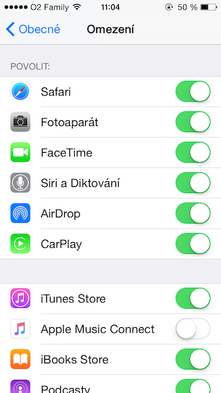 6. Vypněte položku Apple Music Connect