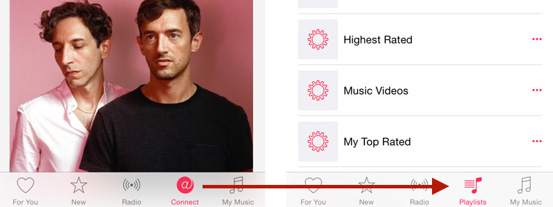 Nyní se vám v aplikaci Music nahradí Connect za Playlisty. Z položky Moje hudba samozřejmě z horní nabídky Playlisty zmizí a síť Connect už nikde nenaleznete.