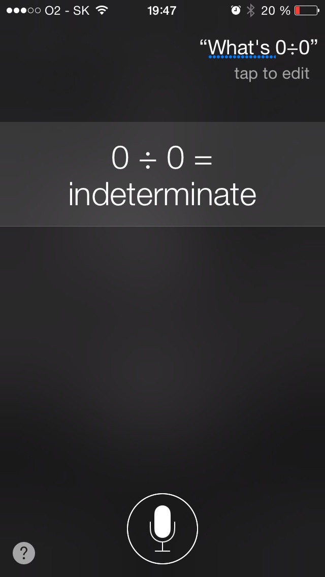 Siri obsahuje niekoľko zaujímavostí a najnovšie vám dokáže odpovedať na to, koľko je 0:0. Teda aspoň sa vám pokúsi na to odpovedať, lenže viete už asi, ako reaguje Siri na otázky, ktoré sú brané väčšinou s nadhľadom. Snaha vydeliť nič ničím je jednou z nich a práve na to vám dá Siri odpoveď, v ktorej sa vám pokúsi znázorniť situáciu na príklade a na záver to okorení výrokom, že snaha rozdeliť 0 koláčov medzi 0 priateľov znamená aj to, že nemáte žiadnych priateľov.