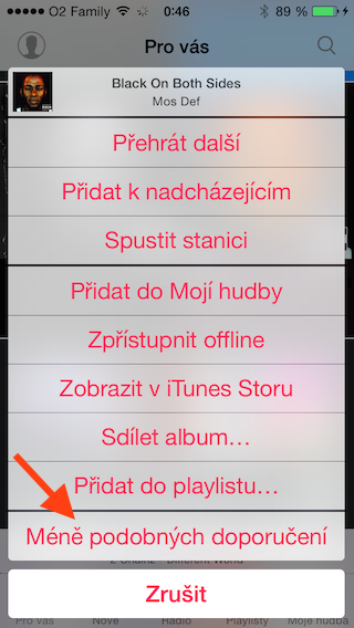 Pokud dlouze podržíte prst na nějakém albu či playlistu v sekci Pro vás, pak se objeví nabídka, na jejiž konci naleznete volbu Méně podobných doporučení. Tím samozřejmě opět upravujete navrhování a vlastně tím Apple Music říkáte, co se vám nelíbí. Funkce je však prozatím omezena pouze na Apple Music na iOS. V iTunes pro Mac či Windows tuto volbu nenaleznete.