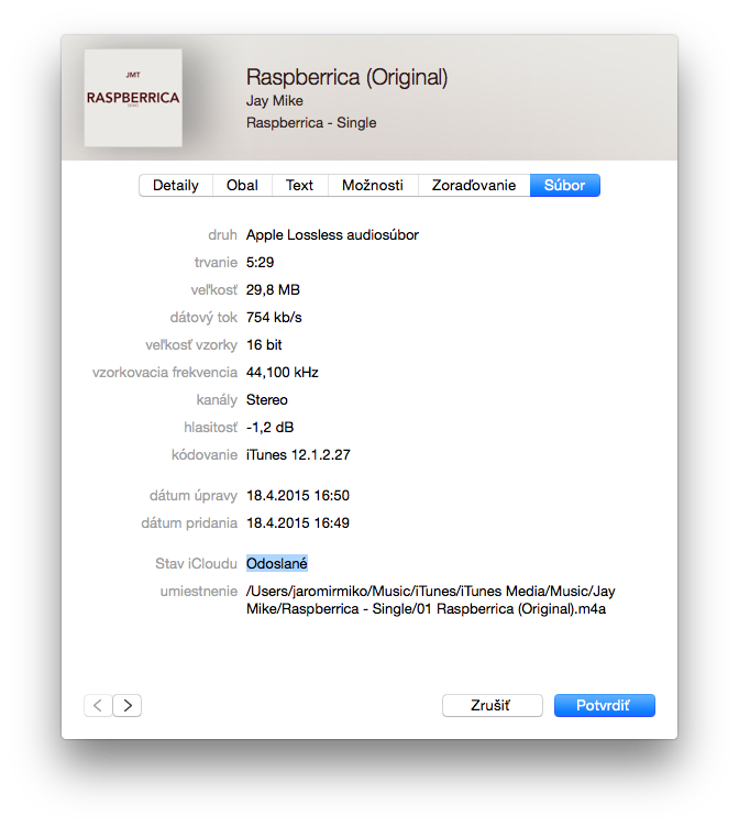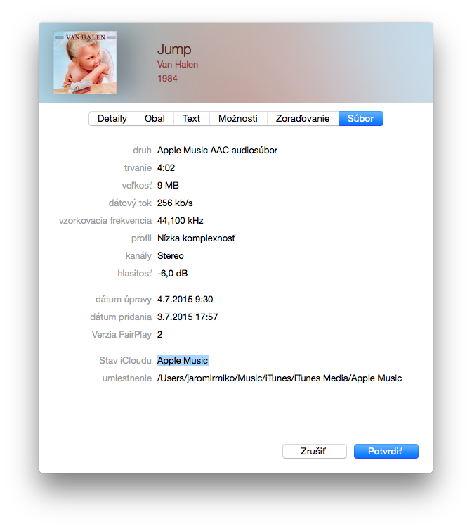 • Uploaded – Hudba, ktorú Apple nedokázal nájsť na svojich serveroch (napr. ak ste nezávislý hudobník a dávate si do svojich zariadení aj skladby, ktoré zatiaľ nepredávate cez žiaden obchod a podelili ste sa o ňu napr. cez SoundCloud). Takáto hudba je bez DRM ochrany a na cloud sa nahrá vo formáte, v ktorom máte skladbu VY. To znamená, že ak ste ju mali ako AIFF, v tomto formáte bude dostupná aj na vašich ďalších zariadeniach.