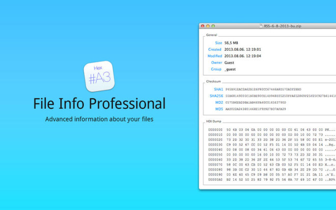 Aplikace File Info vám snadno ukáže rozsáhlé informace o vašich souborech. Díky této aplikaci budete mít rychlý přístup k informacím jako checksum (SHA1, SHA256, MD2, MD5), hexdump či celkovým informacím.