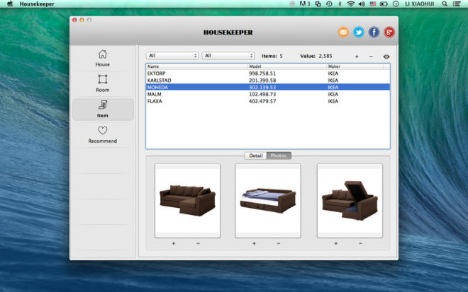 Tato aplikace slouží k organizaci vašeho domu, bytu a předmětů uvnitř. V každém domě/bytu můžete vytvořit jednotlivé místnosti jako obývací pokoj, jídelna, koupelna apod. Můžete také ovládat jednotlivé předměty, ke kterým můžete připojit obrázky, návody, výrobce, cenu a další. Housekeeper také obsahuje automatický výpočet celkové částky a další užitečné funkce.