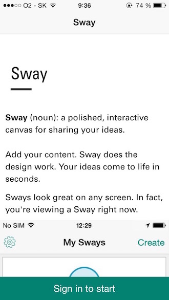 Microsoft počas posledných mesiacov začal rozširovať sadu Office hneď o niekoľko zaujímavých programov a jedným z nich je určite program, ktorý je momentálne dostupný iba ako beta vo vybraných krajinách – Office Sway. Program by sa dal prirovnať k akémusi nástupcovi PowerPointu, ktorý sa zameriava na ukladanie svojich myšlienok a na vytvorenie prezentácií, ktoré ho dokážu čo najlepšie opísať a prípadne aj graficky znázorniť. Čo poteší je, že program nepotrebuje členstvo Office 365 a že aplikácia je, respektíve bude, dostupná zadarmo v App Store pre iPhone so systémom iOS 8 alebo novším.