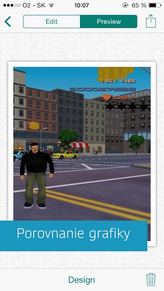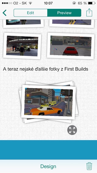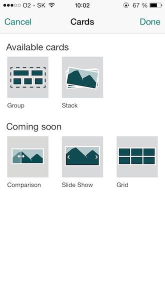 Mobilné rozhranie aplikácie je veľmi jednoduché a hlavne automatizované. To znamená, že máte pred sebou plátno, na ktoré doslova len pridávate nový obsah. Mne sa prostredie páči, okamžite viete, aké máte k dispozícii funkcie a nemusíte sa pohybovať v tone všelijakých nastavení. V paneli si skrátka vyberiete, či chcete pridať obrázok alebo text, spraviť fotku alebo spraviť kolekcie fotiek. Nateraz máte možnosť spraviť galériu fotiek alebo zhrnutie, v ktorom sa pohybujete ťukaním na fotky. V budúcnosti však pribudne aj možnosť pridávania porovnávacích „slidov“, teda môžete priamo ukázať, ako sa vyvinul projekt od predošlého konceptu. Dôležitou súčasťou je tiež možnosť rýchlo zmeniť dizajn celej prezentácie a to pomocou tlačidla Design. Vlastne, navrhnutie nového dizajnu je záležitosť dvoch ťuknutí, najprv si vyberiete grafický motív a potom určite, či chcete, aby sa prezentácia pohybovala zhora nadol alebo zľava doprava.