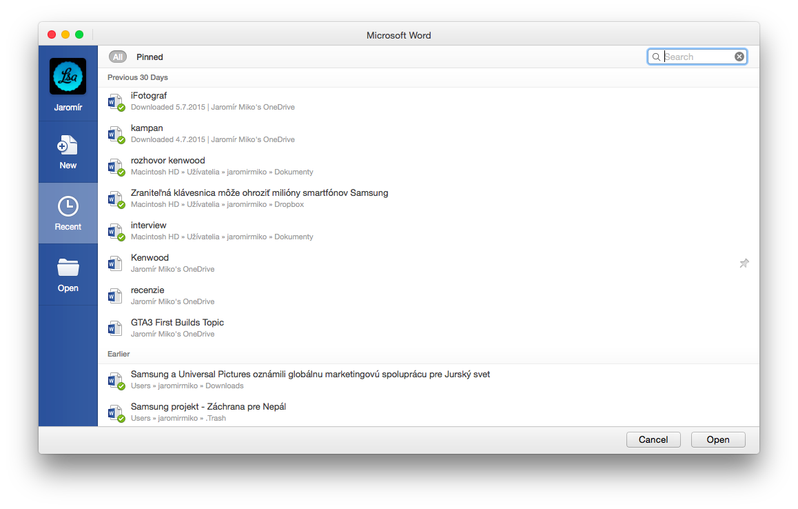Okrem možnosti vytvoriť nový dokument je tu samozrejme možnosť otvoriť niektorý z uložených alebo rozrobených dokumentov. Tie si môžete po novom ukladať nielen lokálne, ale aj na OneDrive, čo prináša zásadnú výhodu v podobe možnosti upravovať svoje dokumenty kdekoľvek. Vďaka cloudu ich môžete upravovať nielen na svojom iPhone a iPade, ale tiež ho môžete upravovať na webe s pomocou nástroja Office Online, ktorý obsahuje odľahčené webové verzie programov Word, Excel, PowerPoint, Outlook, OneNote a tiež obsahuje nový nástroj Sway, ktorému sa budem venovať neskôr.