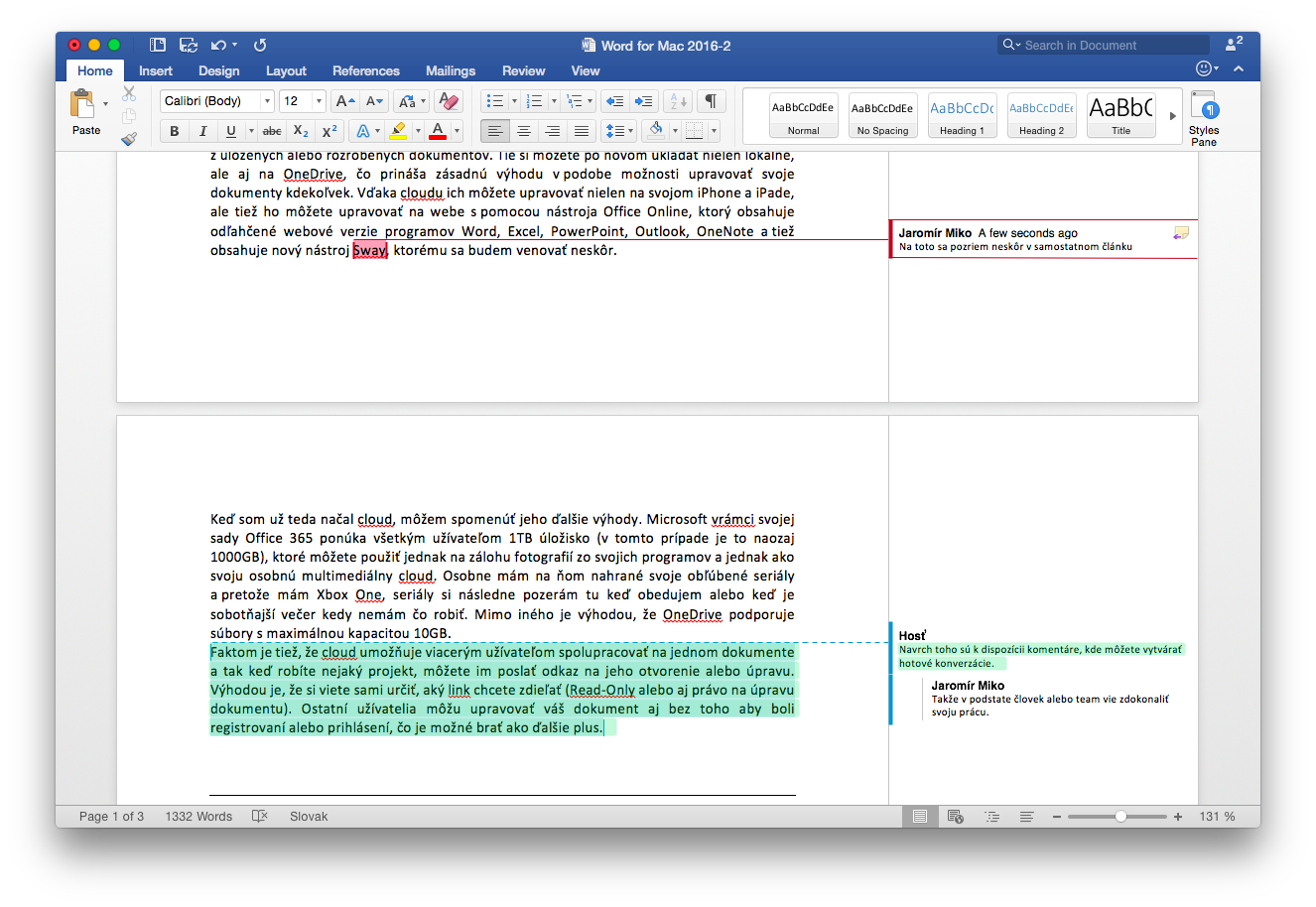 Faktom je tiež, že cloud umožňuje viacerým užívateľom spolupracovať na jednom dokumente a tak keď robíte nejaký projekt, môžete im poslať link na jeho otvorenie a následnú úpravu. Vrámci spolupráce vidíte, kde čo aký užívateľ upravuje a viete sa mu tak vyhnúť. Navrch toho sú k dispozícii komentáre, kde môžete vytvárať hotové konverzácie. Teda že môžete reagovať na jednotlivé komentáre a viete tak zdokonaliť svoj projekt, prácu, príhovor, no skrátka nejaký dôležitý text. Ako pôvodca dokumentu však jednotlivé zmeny nevidíte hneď, ale dostanete na ne upozornenie v spodnej lište, ktoré upozorňuje na dostupné zmeny v dokumente. Naproti tomu užívatelia, ktorí upravujú dokument cez Word Online, vidia zmeny okamžite.