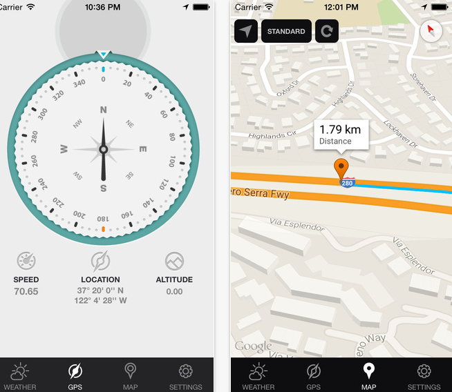 Compass je velmi užitečným pomocníkem nejen pro cestovatele. Obsahuje, zcela nečekaně, opravdový kompas, který vám ukáže reálnou orientaci zařízení k magnetickému pólu a možnost přepínat mezi pravým a magnetickým severem. Compass dále nabízí mapy (standardní, satelitní apod.), sledování vzdálenosti, kurzu, rychlosti a nadmořské výšky. Součástí aplikace jsou také informace o počasí – teplota, vlhkost a tlak.