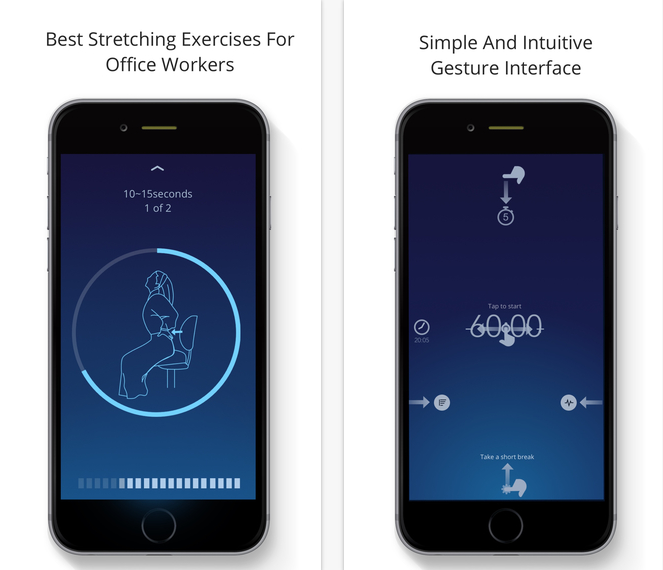 Velmi užitečná aplikace pro osoby, které musejí po dlouhou dobu sedět u počítače. Takto prosezené hodiny mohou způsobovat řadu zdravotních problémů a díky Rest+ se těmto potížím můžete zcela vyhnout. Jedná se o 7 minutové cvičení pro pracovníky, kteří mají sedavé zaměstnání. Dále vám aplikace mapuje délku sezení v rámci dne, týdne a měsíce.