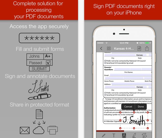 Vyplňujte, podepisujte a opatřete poznámkami své PDF dokumenty. Aplikace nabízí možnost sdílení za pomocí emailu, Dropboxu, Google Drive či si přímo dokumenty vytisknout. PDF Forms vám umožní zaheslovat přístup k určitým složkám, dokumentům a podpisům. Dále aplikace umí rozdělit jeden dokument PDF na vícero dokumentů.