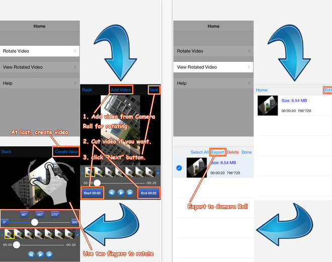 Díky této aplikaci můžete otáčet vaše videa rychle, snadno a přímo na vašem iOS zařízení. Pokud jsou videa špatně otočená i při přehrávání ve Windows, tak tento problém umí aplikace Rotate Video 360° také vyřešit. Po přetočení jsou videa ukládána do vaší osobní složky.