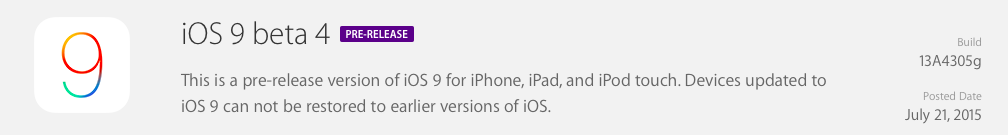 Spoločnosť Apple dodržuje svoj dvojtýždňový interval a aj keď predošlé beta verzie svojich systémov vydal v stredu, dnes sa začína všetko vracať späť do starých kolají. Apple totiž práve rozposlal vývojárom štvrtú beta verziu operačného systému iOS 9, ktorý vychádza na jeseň/podzim pre širokú verejnosť a bude zároveň zrejme poslednou verziou systému pre iPhone 4s, iPod touch 5. generácie, iPad 2 a pôvodný iPad mini. Systém s tonou vylepšení by však mohol byť celkovo posledným pre 32-bitové zariadenia, keďže súčasťou systému je aj API, ktoré umožňuje vývojárom ľahko vypustiť podporu pre 32-bitové zariadenia, teda pre iPhone 5c a staršie.