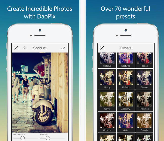 DaoPic je snadno ovladatelný a výkonný fotoeditor. Vytvářejte dokonalé snímky během okamžiku. Aplikace nabízí přes 20 různých funkcí, které vylepšují vaše fotografie, více než 70 přednastavených filtrů a další nezbytné nástroje pro kvalitní upravování.