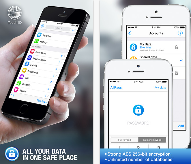 AllPass je skvělou aplikací, která uchová v bezpečí všechny vaše nepostradatelné informace. Ukládejte si všechny vaše přihlašovací údaje, informace o kreditních kartách, soukromé poznámky, prostě cokoliv vás napadne. AllPass vám umožní přihlašovat se na různé webové stránky, aniž byste si museli pamatovat přihlašovací údaje či za vás automaticky vyplní údaje o kreditce, takže nemusíte nic vyplňovat.