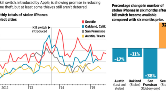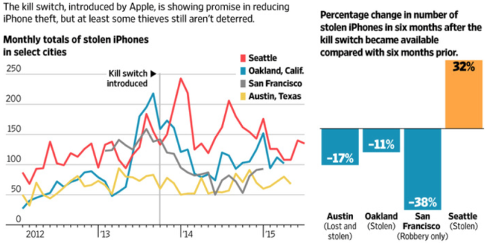 Jakmile Apple představil v iOS 7 funkci Activation Lock, okamžitě klesly krádeže iPhonů v několika amerických městech až o 50%. Jenže policejní data sesbíraná společností WSJ ukazují, že původní tvrzení není zase tolik pravdivé, jak se původně zdálo. Krádeže iPhonů klesly například v Oaklandu o 11% a v Austinu o 17%, ale v takovém Seattlu dokonce stouply o 32%. Kradou se zejména starší iPhony, které nepodporují iOS 8, kde je funkce Activation Lock defaultně zapnuta, tudíž mají zloději větší pravděpodobnost, že v zařízení bude buďto starší iOS nebo bude funkce deaktivována.