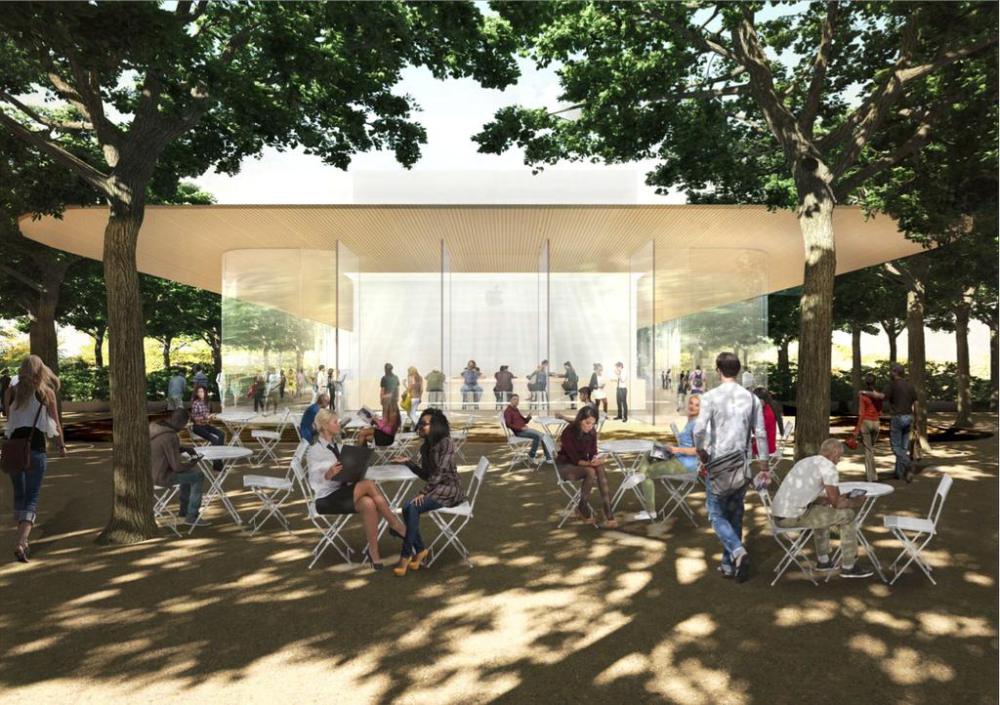 Plocha by měla být elegantní jako některé Apple Story, jelikož by měla být převážně skleněná a nabídnout i střechu. Pod ní by se měla nacházet 2386 metrů čtverečních velká kavárna a obchod pro fanoušky, kterým zde umožní zakoupit nejnovější produkty společnosti Apple. Odsud budou na plošinu vést schody a výtahy, které by vás měl vyvézt o 7 metrů výše, kde si můžete prohlédnout celý areál.