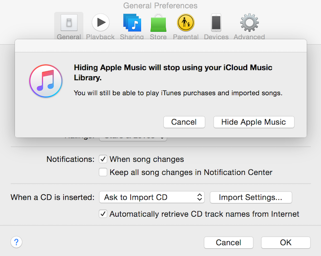 V případě OS X se Apple Music nachází v iTunes, kde ji musíte také vypnout. Stačí když otevřete iTunes a v menuBar vyberete možnost iTunes – Preferences a v položce General vyberete možnost nezobrazovat apple Music, což stačí následně potvrdit možností Hide Apple Music ve vyskakovacím okně, které se zobrazí.