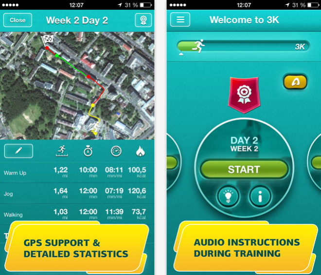 Start running je čtyřtýdenní tréninkový program, který vám pomůže zlepšit kondici. Aplikace vám nabízí efektivní tréninkové plány vytvořené profesionálními trenéry. Samozřejmostí je počítání kalorií a detailní statistiky jako vzdálenost, čas, tempo a další. Aplikace spolupracuje s Runkeeper, Fitbit, MapMyRun.