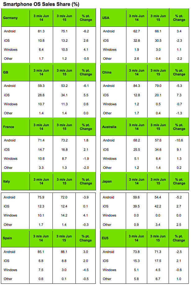 Podobná situace nastala i v Evropě, akorát ne tak s výraznými čísly. Například ve Velké Británii klesl meziročně podíl Androidu o 6,1%, ale na úkor této ztráty stoupl podíl iOS o 5,5% a zbytek si „ukradl“ Windows Phone, který zaznamenal meziroční nárůst podílu o 0,6%.