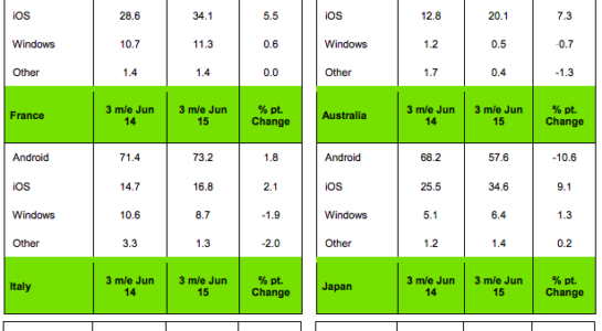 Společnost Katnar Worldpanel zveřejnila svá nejnovější data zaměřující se na podíl jednotlivých mobilních platforem na trhu po celém světě. Katnar uvádí, že během druhého čtvrtletí tohoto roku se podíl iPhonu respektive iOS zvýšil ve všech zemích kromě USA. Podíl mobilního iOS roste v Austrálii, Číně a na všech pěti největších trzích v Evropě, mezi kterými samozřejmě nechybí sousední Německo a dále pak Francie, Itálie nebo Velká Británie. Nárůst podílu trhu jablečných telefonů je ve druhém čtvrtletí poněkud překvapující, jelikož prodeje iPhonů obvykle spíše stagnují vzhledem k očekávanému představení nového modelu v září.