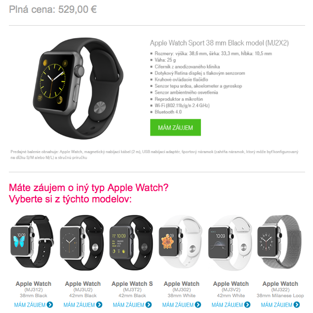 Telekom umožňuje rezervovať si niektorý model hodiniek podobným štýlom ako to umožnil Apple, teda že zadáte svoje meno a kontaktné údaje a následne si len počkáte, až bude váš model k dispozícii. Hodinky si budete môcť zaobstarať dvomi cestami – buď zaplatíte plnú sumu, čo v prípade 38mm Apple Watch Sport činí 529€ alebo si ich kúpite cez niektorý z paušálov Happy, kde budete platiť mesačne za paušál. V prípade modelu Watch Sport 38mm to činí: