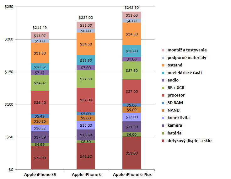 Nápis Assembled in China v případě iPhone 6 Plus totiž skrývá částku $242. Ano, přesně tak, nějakých 5 884 Kč. V případě menšího iPhone 6 je výrobní cena stanovana na $227, tedy nějakých 5520 Kč. Možná si řeknete, že ty částky jsou opravdu směšné a že Apple se snaží jen si nahrabat co nejvíce peněz, je ale hodně důležité uvědomit si, co vše skrývá druhý nápis.