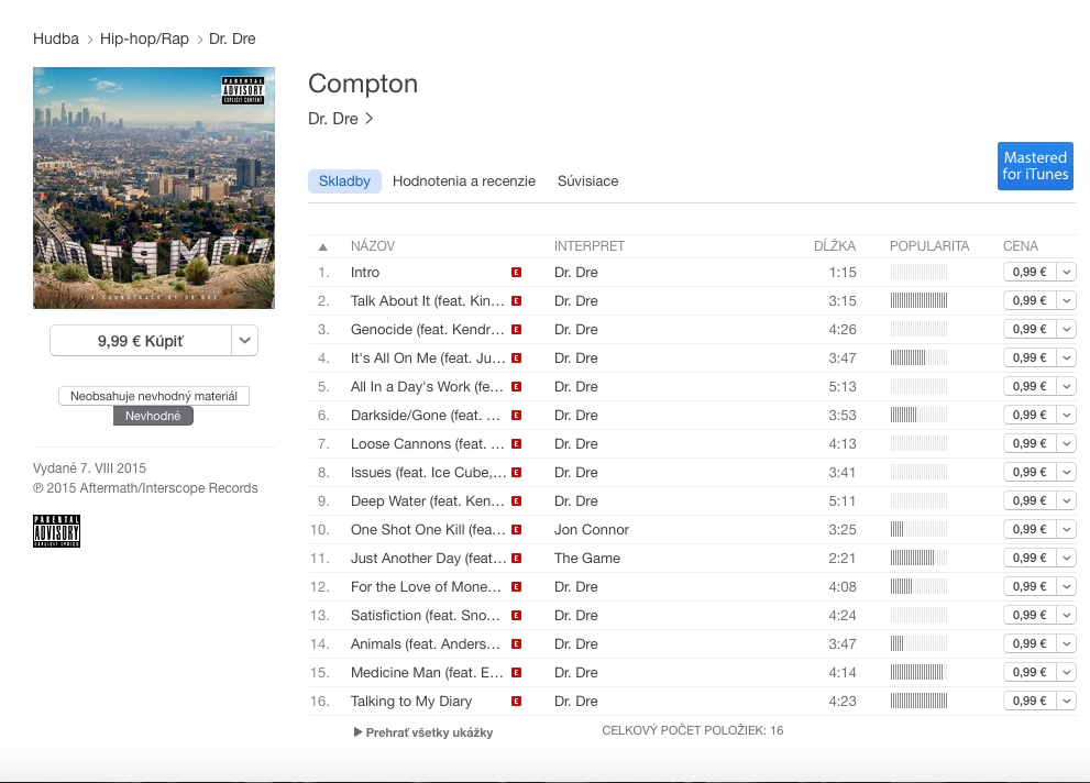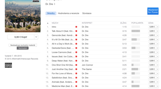 Funkciu sme si všimli len pred chvíľou pri čerstvo vydanom albume Compton od Dr. Dre, ktorý je v obchode dostupný očividne v oboch verziách. Či si užívateľ vyberie verziu s nevhodnými textami alebo si vyberie čistú verziu, nemá vplyv na výslednú cenu. Verziu albumu si viete vybrať pod tlačidlom pre kúpenie albumu.