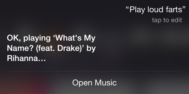 Téměř každého při čtení nadpisu pravděpodobně napadlo, že Siri asi přehrává nějaké nevhodné zvuky. A měli jste pravdu, jelikož to doopravdy umí. Přibližně před měsícem server Cult of Mac zjistil, že pokud Siri řeknete, aby přehrála hlasité prdy, začala hrát skladbu “What’s my Name” od Rihanny. Zpěvačka asi nebyla moc ráda a možná ona nebo možná někdo jiný si postěžoval Applu a ten okamžitě chybu opravil. Nyní, pokud Siri řeknete stejný příkaz, tak už doopravdy začne přehrávat zvuky prdů. Vyzkoušet si to můžete i sami, stačí říct následující příkaz.