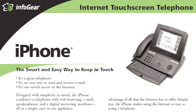 První telefon nazývající se iPhone byl totiž od společnosti Cisco, která je i v současnosti velkým hráčem na poli síťových prvků, a právě v roce 1998 získala společnost Infogear, která představila úplně první iPhone na světě s dotykovou obrazovkou. Díky akvizici se z Infogear stala součást Cisca a proto se také iPhone stal produktem společnosti Cisco. Zajímavostí také je, že Infogear představil svůj první iPhone ve stejném roce, kdy Apple představil první iMac, tedy počítač, na kterém už opět pracoval Steve Jobs po svém návratu do Applu a na začátku jeho názvu použil poprvé slavné „i.“