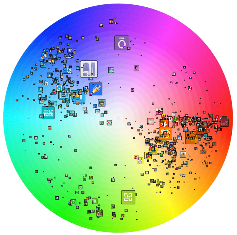 Stuart Hall z Appbot totiž vzal nejpopulárnější aplikace z App Storu a vygeneroval na barvách jejich ikon tzv. ikongrafiku, kde můžete vidět, jaké barvy pro ikony jsou ty vůbec nejpoužívanější. Stuart vzal 200 nejpopulárnějších placených aplikací a 200 nejpopulárnějších aplikací zdarma. Velikost ikon je pak přímo úměrná oblíbenosti neboli stahovanosti jednotlivých aplikací.