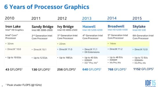 Okrem toho sú nové grafické čipy Iris Pro vybavené podporou pre moderné technológie a podporujú technológie DirectX 12, OpenCL 2 a OpenGL 4.4, všetky s podporou 4K rozlíšenia. Ak by sme chceli zachádzať do detailov, potom nové čipy Iris Pro obsahujú tranzistory, ktoré sú určené priamo pre dekódovanie 4K videa a tiež pre jeho kódovanie. Grafika Iris Pro sa nijak nezapotila ani pri prehrávaní 4K RAW videa z kamery Canon, pričom o plynulé prehrávanie bez frame dropu sa postarala práve vyspelá grafika. Keby ju procesory Skylake neobsahovali, užívatelia by mali viditeľné problémy s plynulým prehrávaním.