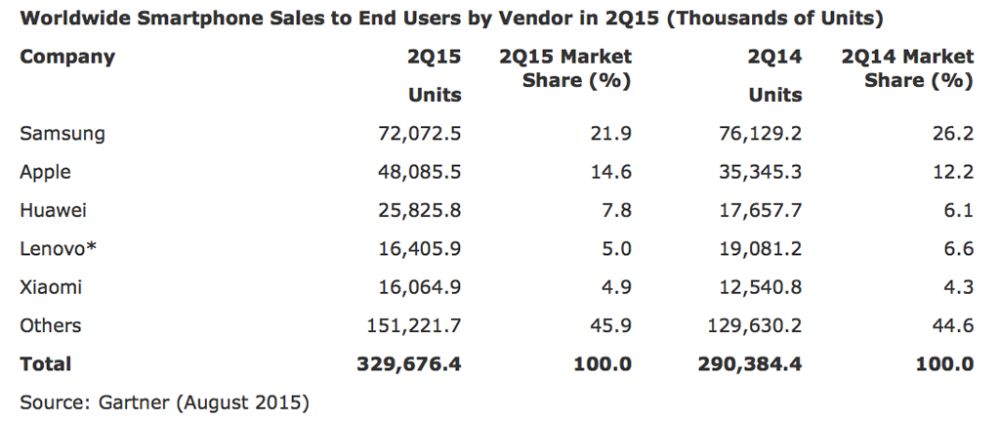 Napriek tomu je Samsung naďalej dominantným výrobcom smartfónov na svete. Jeho podiel činí 21,9% na svetovom trhu, kým pred rokom to bolo 26,2%. Podiel Applu narástol z 12,2% na 14,6%. Tretím najväčším výrobcom je prekvapivo Huawei, ktorého podiel v tomto štvrťroku činí 7,8%. Zaujímavosťou je aj fakt, že Xiaomi skončilo na piatom mieste tabuľky so 4,9% podielom. Applu sa veľmi dobre darí v segmente high-end telefónov, kde spoločnosť zaznamenala dvojciferný nárast oproti minulému roku a zároveň tak výrazne ochromila predaje konkurenčných výrobcov, ako aj ich marže. Výrobcovia ako Samsung kvôli tomu museli spraviť poriadok vo svojom portfóliu a začali sa sústrediť viac na boj v oblasti mid-range a low-end telefónov. Príkladom je napríklad Samsung, ktorý namiesto zaužívaných mien (Samsung Galaxy Grand Max Neo Plus Duos) oznámil série, ktoré majú spoločné črty a vlastnosti (Galaxy A, Galaxy E, Galaxy J). Applu narástli predaje v Číne o 68%, čo je veľký úspech vzhľadom k tomu, že tamojší trh klesol o 4%. Dôvodom podľa analytika je, že iPhone a značka Apple reprezentuje sociálny status.