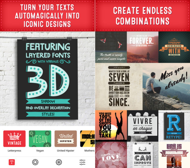 Retype je skvělou aplikací pro všechny nadšence do typografie. Dodejte svým fotografiím nový rozměr přidáním různých typů písma. Přidejte svému textu 3D, stíny a různorodé barvy. Retype také nabízí velkou kolekci filtrů k dokončení vašeho výtvoru.