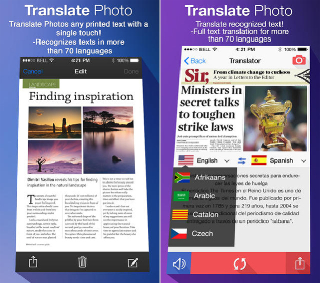 Translate Photo extrahuje text z jakéhokoliv vytisknutého zdroje – dokumenty, knihy, návody a další a umožní vám okamžitě text přeložit do libovolného jazyka, na výběr máte 90 cizích jazyků. Jednoduše vyfoťte obrázek s textem a poté ho můžete editovat, překládat, sdílet na sociálních sítích či zaslat emailem. Aplikace umí rozpoznat více než 70 cizích jazyků, překládat do 90 jazyků a předčítat text ve více než 44 jazyků.