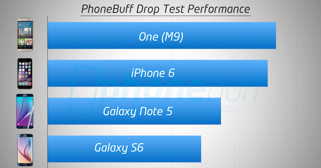 I když to vypadá, že Galaxy Note 5 moc nevydrží, i tak předbíhá svého bratříčka Galaxy S6, který ve stejném testu nevydržel vůbec hned po pádu na záda. Jak můžete vidět na jednoduchém srovnání níže, zlatou medaili má stále HTC One (M9), těsně za ním je pak na druhém místě iPhone 6 a poté se značným rozdílem Note 5 a Galaxy S6.