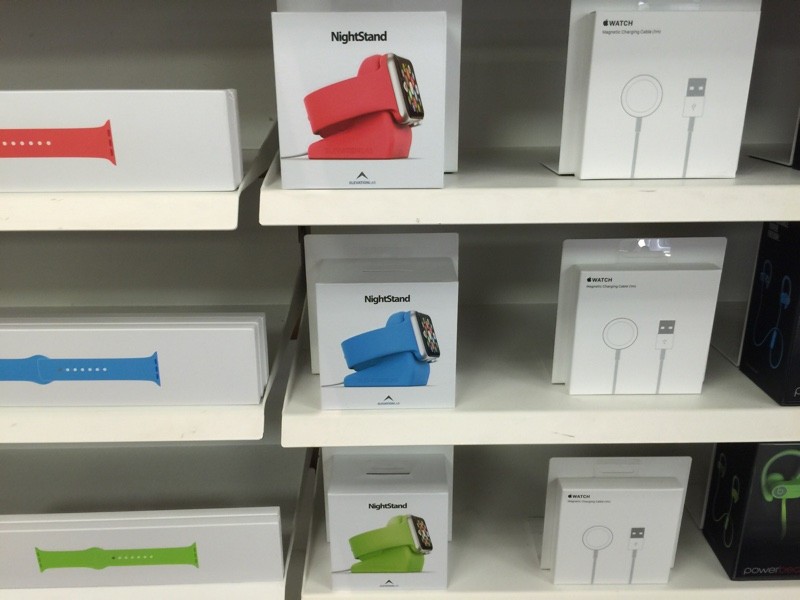 Apple Store prechádza obrovskou zmenou a nielen, že od dnešného dňa zo stolov zmizli informačné iPady 2, ale zároveň sa tu začalo predávať príslušenstvo pre Apple Watch od výrobcov tretích strán. Aj tu spoločnosť myslela na detaily a krabice produktov majú potlač, ktorá pôsobí, akoby išlo o oficiálny produkt z dielne Applu. Bonusom k tomu je usporiadanie produktov na poličkách – na každej poličke sa totiž nachádza príslušenstvo konkrétnej farby, s výnimkou niektorých univerzálnych produktov ako sú napríklad nabíjačky. Zákazníci však majú možnosť kúpiť si stojan NightStand, ktorý sa dočkal nových farieb. Kým doteraz boli v predajie len modrá, čierna a červená verzia, po novom je v predaji modrá, zelená, čierna, biela a ružová, takže produkt teraz príjemne ladí s Apple Watch Sport.
