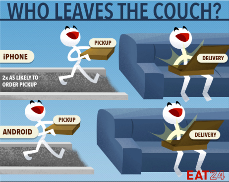 V prípade zeleniny je ale rozdiel medzi užívateľmi iPhonu a Androidu o trochu menší. Podľa štatistiky si 35% majiteľov iPhonu objednalo jedlo so zeleninou, zatiaľ čo na Androide to bolo 28%. Na druhú stranu, majitelia Androidu majú radšej pikantné jedlo a prekonali majiteľov iPhonu o 10%. Aj by som povedal, že podľa štatistiky mám bližšie k Androidu, než k iPhonu, lenže ako užívateľ Androidu by som sa poslednou informáciou nechválil – u majiteľov iPhonu je totiž dvakrát vyššia šanca, že si jedlo vyzdvihnú osobne. Android má teda titul Kráľ gauča.