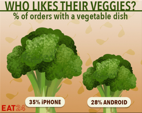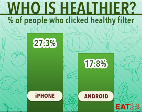 Dnes už nie je žiadnou novinkou objednať si jedlo z internetu. Novinkou je ale robiť si štatistiku o tom, kto sa stravuje zdravšie a následne povedať svetu, ktorí užívatelia žijú zdravým životným štýlom a ktorí naopak nie. Takúto štatistiku spravila americká služba Eat24, ktorá sledovala, aké jedlá si objednávajú užívatelia iOS a Android zariadení a vo svojom prieskume zistila, že majitelia iPhonu na tom boli počas uplynulých troch mesiacov lepšie, než majitelia HTC, Samsungov, LG a iných Android zariadení. Samotná štatistika bola vytvorená na základe toho, koľko užívateľov si pri objednávke jedla aktivovalo filter „zdravej“ stravy a zatiaľ čo na iPhone túto položku zaškrtlo 27,3% zákazníkov, na Androide to bolo len 17,8%.