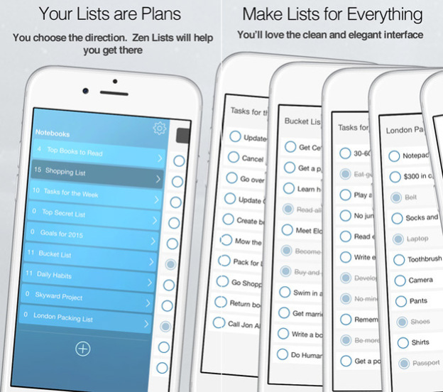 Zen Lists se zaměřuje na vytváření seznamů na prakticky cokoli. Aplikace Zen Lists byla vytvořena k tomu, aby byla co nejjednodušší, ale zároveň také nejvýkonnější. Aplikace je rychlou a spolehlivou cestou k vytváření úkolů, cílů, seznamů vašich předmětů a dalších listů. Seznamy mohou být dále lehce sdíleny.