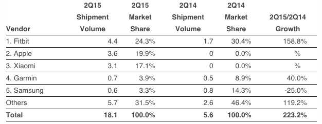 Celkovo mal Apple predať 3,6 miliónov hodiniek, pričom je na druhom mieste. Na prvom je obľúbený výrobca fitnes trackerov Fitbit, ktorý počas minulého štvrťroku predal 4,4 miliónov trackerov. Na tretom mieste sa nachádza Xiaomi, ktoré sa dostalo dopredu vďaka svojmu vlastnému wearable zariadeniu, ktoré prišlo na trh s naozaj agresívnou cenou – nestojí ani 20€. Je teda široko dostupné a nečudo, že Xiaomi predalo 3,1 miliónov kusov a získalo 17,1% podiel na trhu, kým Apple mal 19,9% a Fitbit 24,3%. Fitbit zaznamenal medziročný nárast o 158,8%. Samsung si pohoršil a skončil na piatom mieste so 600 000 hodinkami a 3,3% podielom – pre zaujímavosť, minulý rok mal 14,3% a bol na druhom mieste.