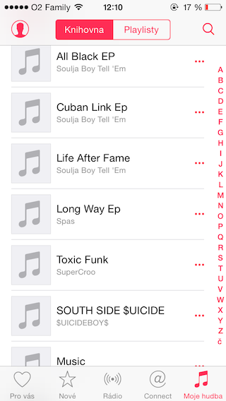 Ale teď už k samotné službě jako takové. Osobně mi jak na Macu, tak na iPhonu přijde neuvěřitelně nepřehledná, složitá a hlavně nedodělaná. Nahrál jsem si do iCloud Music Library všechna svá alba z iTunes a do dnes mi nejméně 30% z nich vůbec nefunguje a dalších 10% bylo nahrazeno úplnými nesmysly. Nezbývá mi nic jiného, než se celou knihovnu vzít, zazálohovat na externí disk, pak asi vymazat celý obsah v iTunes a opět to zkusit nějak nahrát, a to se mi vůbec nechce, což dokazuje i to, že jsem se k tomu ještě během dvou měsíců nedostal. Moc nechápu, co by dělal běžný člověk, který rozumí sotva tomu, jak Mac zapnout a prohlížet si seznam.cz. Musel by jedině do Apple Storu nebo v našem případě k některému z resellerů. Jak vypadá spousta mých nefunkčních alb a skladeb na iPhonu, můžete vidět níže.