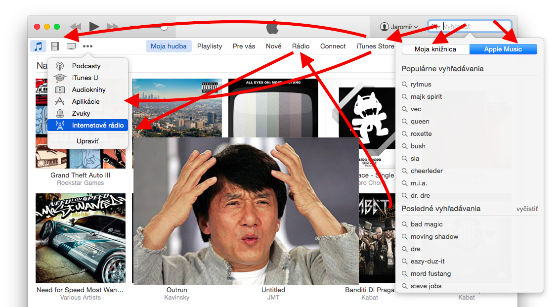 S tým iTunes súhlasím s Jarom. Vadí mi už len fakt, že My Music je v iTunes na prvom mieste a v iOS na poslednom. Vidno, že iTunes na Apple Music nieje odladené a neponúka tú správnu UX. Plus ak sa pridajú bugy v podobe nefungujúceho airplay pri Beats1, scrollbary bez zotrvačnosti, lagy pri retina displejoch, no proste užívateľská skúsenosť 0 bodov. Chcelo by to iTunes úplne prerobiť a zjednotiť s iOS čo sa týka sekcií a kľudne by som bol aj za ikony sekcií ako v iOS namiesto kopy textu…