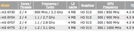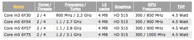 Intel by tento rok mohol rozdeliť procesory Core M na niekoľko sérií a vyzerá to, že sa dočkáme čipov Core m3, Core m5 a Core m7, kde bude číslo určovať výkon (a bude vám pripomínať BMW). Základným modelom má byť procesor Core M3-6Y30, čo je dvojjadrový čip s frekvenciou 900 MHz a Turbo Boost do 2.2 GHz. Čip obsahuje 4MB L3 cache a grafickú kartu Intel HD 515 s frekvenciou 850 MHz. Mohlo by sa jednať o procesor, ktorý uvidíme v základnom modeli MacBooku, ktorý sa u nás predáva za cenu okolo 1400€.